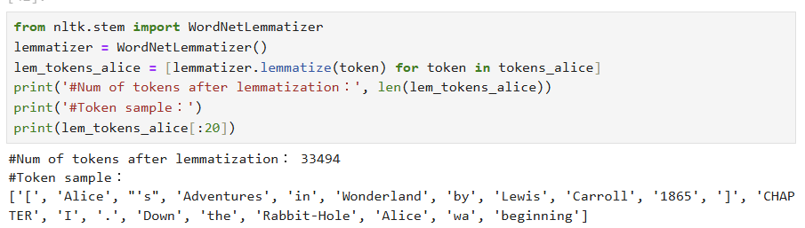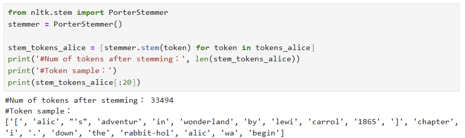 => 위 결과들을 종합적으로 볼 때, 토큰 수는 변하지 않음. -> W? 토큰화된 결과에 대해 개별적으로 어간 추출과 표제어 추출을 수행하기 때문.