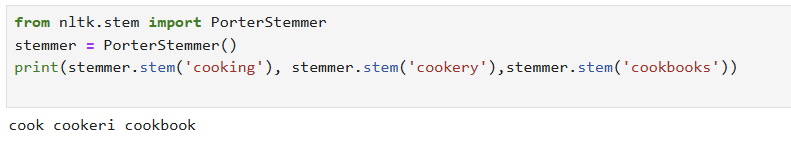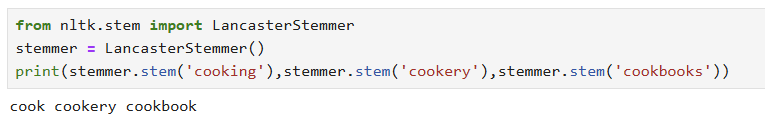 -> 포터 스테머와 비교했을 때, 현재분사와 복수형에 대한 처리( cooking과 cookbooks)는 동일하지만 cookery에 대한 결과는 다름.