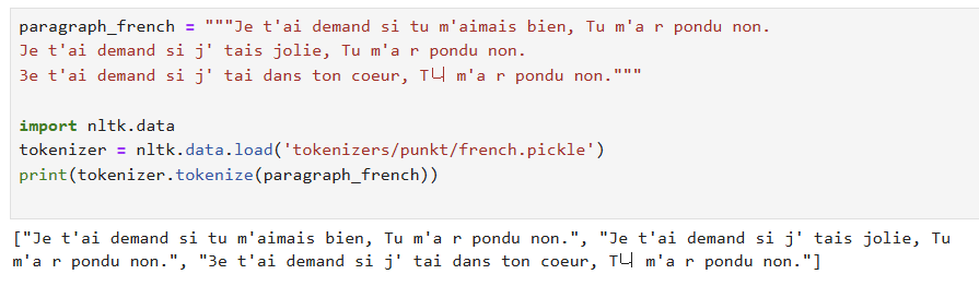 - 다른 언어에 대해 문장 토큰화를 하려면 사전학습된 모델을 지정해 불러올 수 있음.
