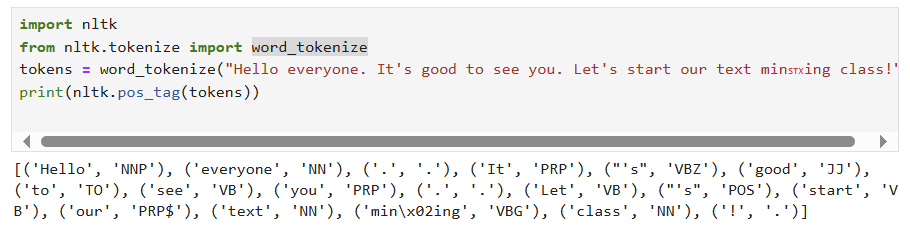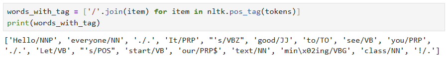 - nltk.pos_tag()은 토큰화된 결과에 대해 품사를 태깅해 [단어, 품사] 로 구성된 튜플의 리스트로 품사 태깅 결과를 반환해 줌.