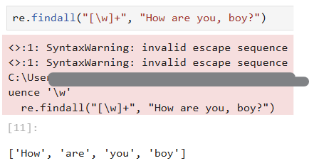 \w에는 공백이 포함되지 않아서 이걸 활용해 주어진 문자열에서 공백이나 쉼표 등으로 구분되는 단어들을 찾아낼 수 있음.