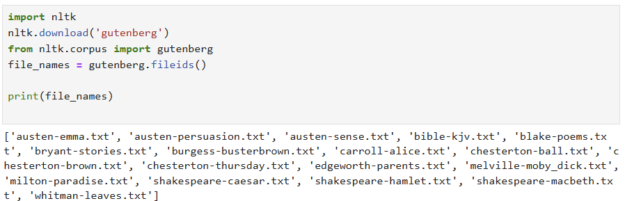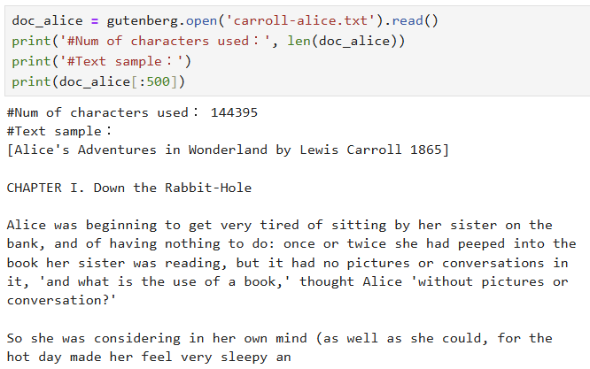 -> gutenberg.open()으로 파일 제목으로 해당 파일을 열 수 있고, read()로 그 내용을 읽어 올 수 있음.