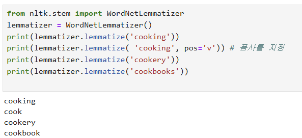 -> WordNetLemmatizer는 품사를 따로 지정하지 않으면 cooking 에 대한 기본형으로 동일한 cooking을 반환하는 것을 볼 수 있음.